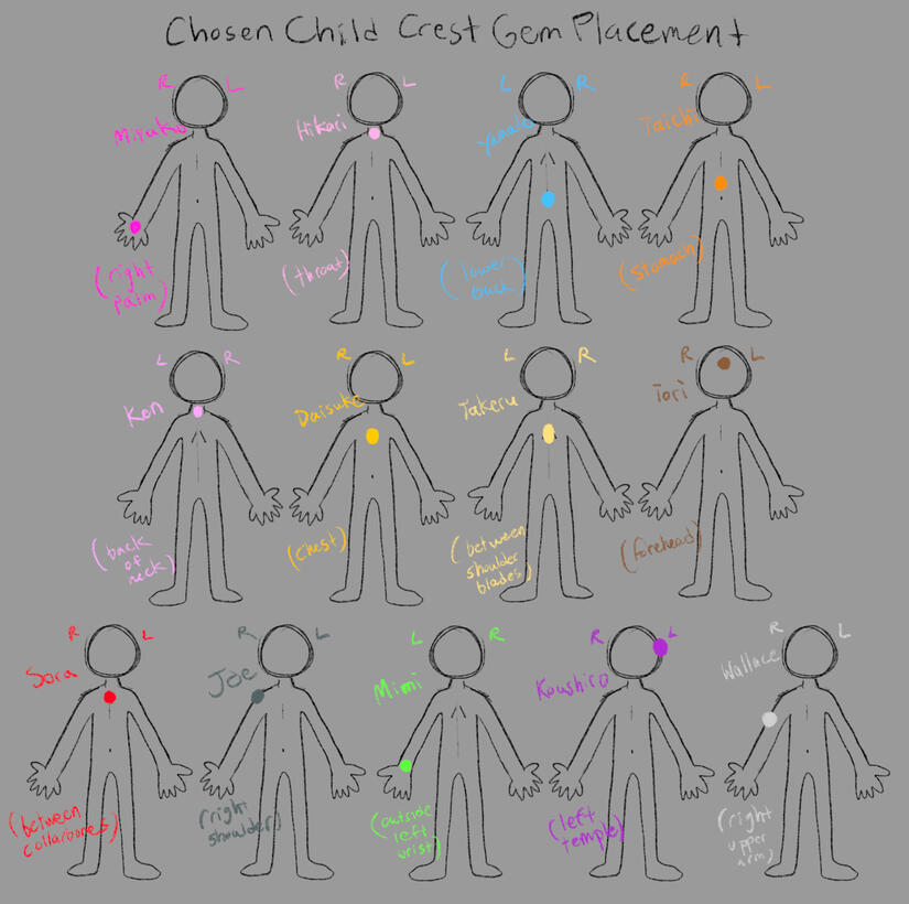 You remember at the end of Digimon Adventure when the kids all realize their crests are not separate, but inside them and part of them? This AU diverges from that point by having them glow and then their gems appear at that exact moment and then they just have the crests on their physical bodies from that point on in the canon. There are implications and the 02 kids get their gems at different points in the story of Adv 02, but the overall story is the same.